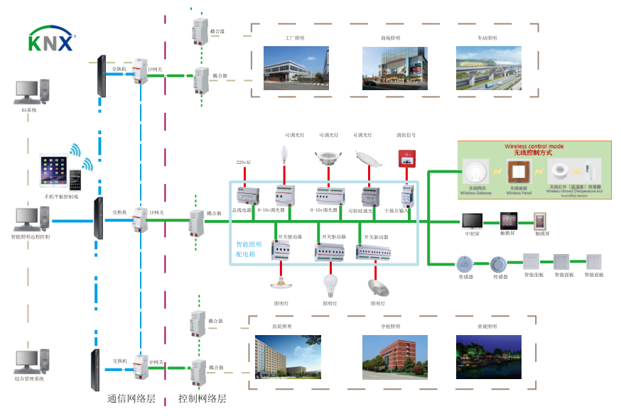 系统通过标准的2*2*0.8EIB BUS总线(即KNX总线)将所有的智能照明控制模块连接到一起,并组成一套完整的控制系统。该系统理论最大连接控制模块数量达58000多个,在实际项目应用中,系统即可实现照明灯具的远程集中控制,又可实现就近控制功能。其灵活多样的智能化控制及庞大的设备容量,特别适用于医院、学校、酒店及各类体育场所、机场、隧道等大型公建项目照明系统的智能化控制。