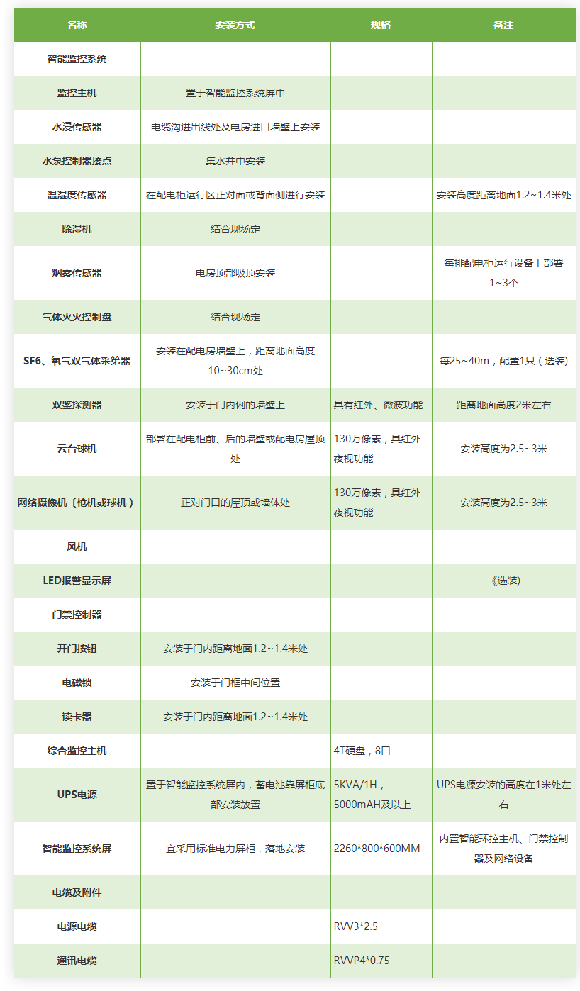 配电室综合监控系统包括智能监控系统屏、通讯管理机、UPS电源、视频监控子系统(云台球机、枪机)、环境监测子系统(温度、湿度、水浸、烟感)、控制子系统(灯光、空调、除湿机、风机、水泵)、门禁监控子系统(读卡器、开门按钮、磁力锁)、安防监控子系统(双鉴检测器)。