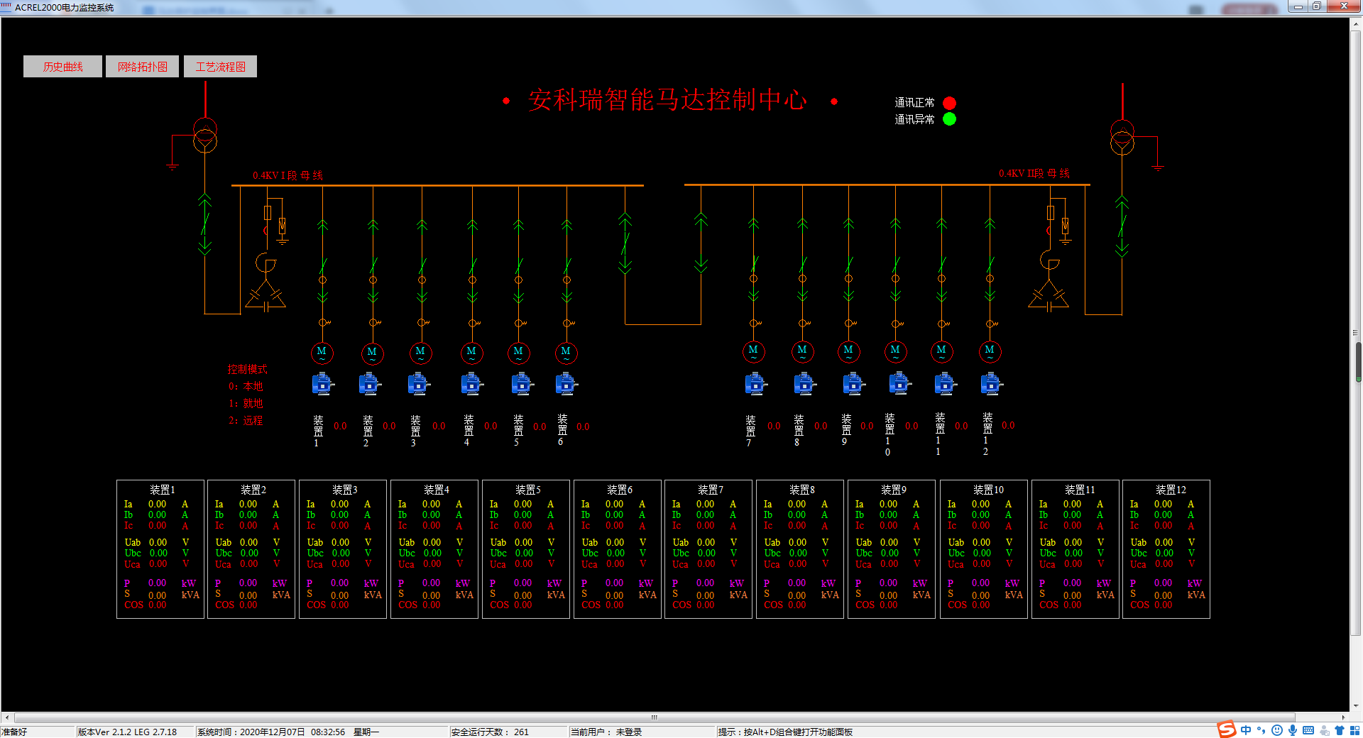 以配电一次图的形式直观显示电机的运行状态,实时监测各电机、电压、电流、功率、功率因数等电参数信息,动态监视各电参量,有关故障、告警等信号。