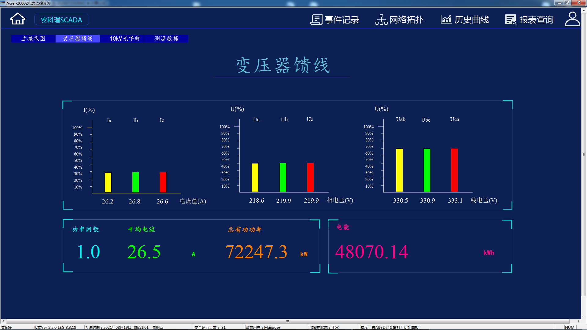 Acrel-1000综合自动化监控系统在配电一次图中,可以直接查看该回路详细电参量,界面也可用棒图的形式更直观的展示三相电流、三相电压、有功功率、无功功率、功率因数、电能等。