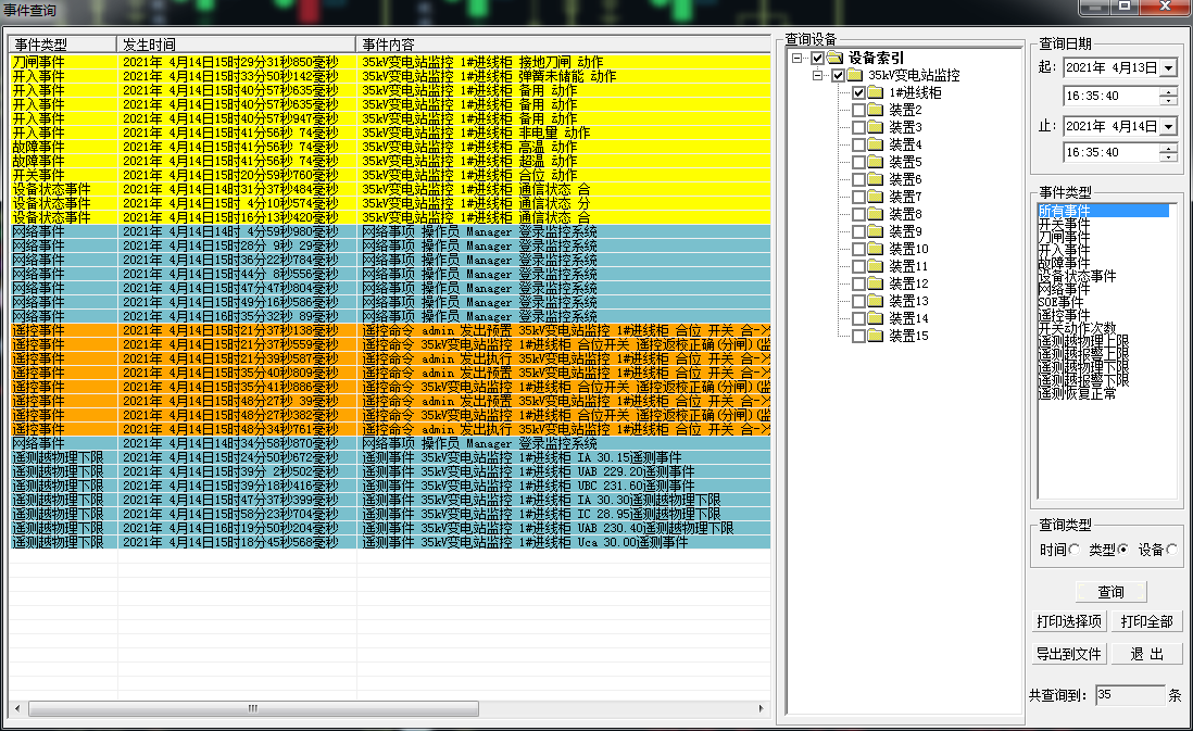 Acrel-1000综合自动化监控系统能够对遥信变位,保护动作、事故跳闸,以及电压、电流、功率、功率因数越限等事件记录进行存储和管理,方便用户对系统事件和进行历史追溯、查询统计、事故分析。可以按时间、类型和设备进行查询和排序。